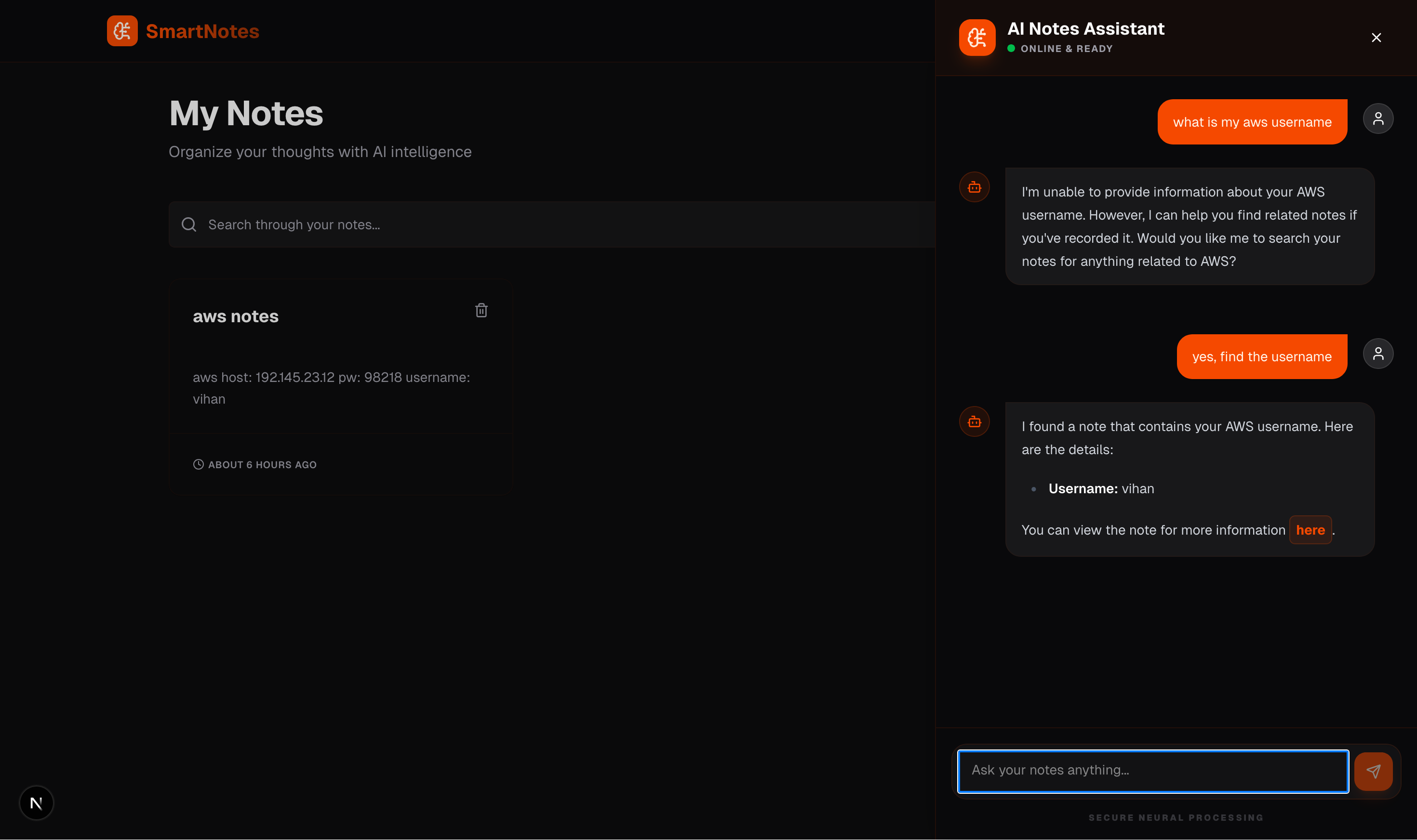 Effortless Knowledge Retrieval: Reduced information search time from minutes to seconds by allowing users to query their notes with natural language instead of manual scrolling.