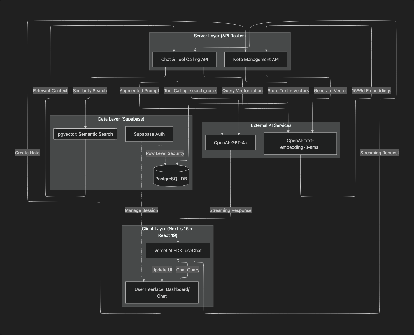 I developed a full-stack solution featuring a Retrieval Augmented Generation (RAG) architecture. By implementing semantic search with Supabase pgvector and OpenAI embeddings, I enabled a context-aware chat interface where users can "talk" to their notes. The result is a highly responsive system that doesn't just store text, but understands it, providing instant answers based on the user's personal knowledge base.