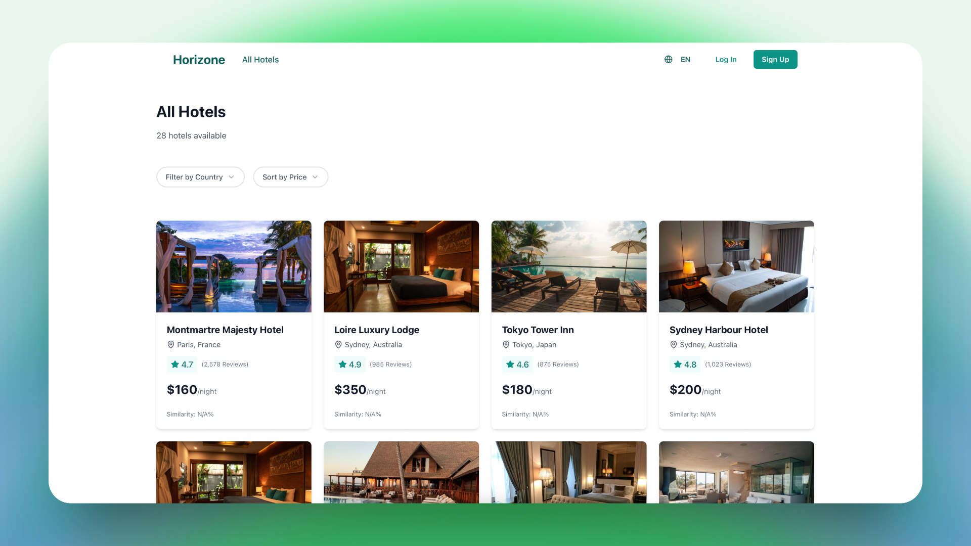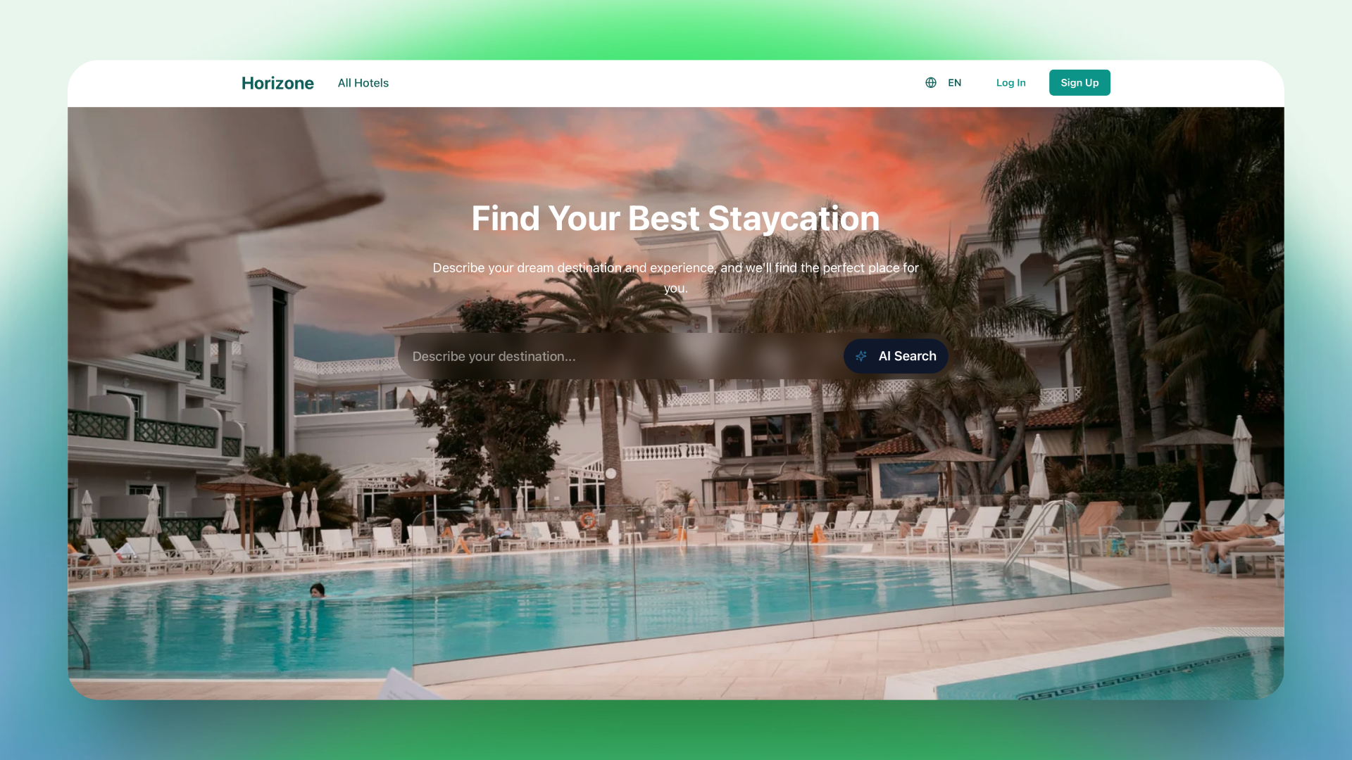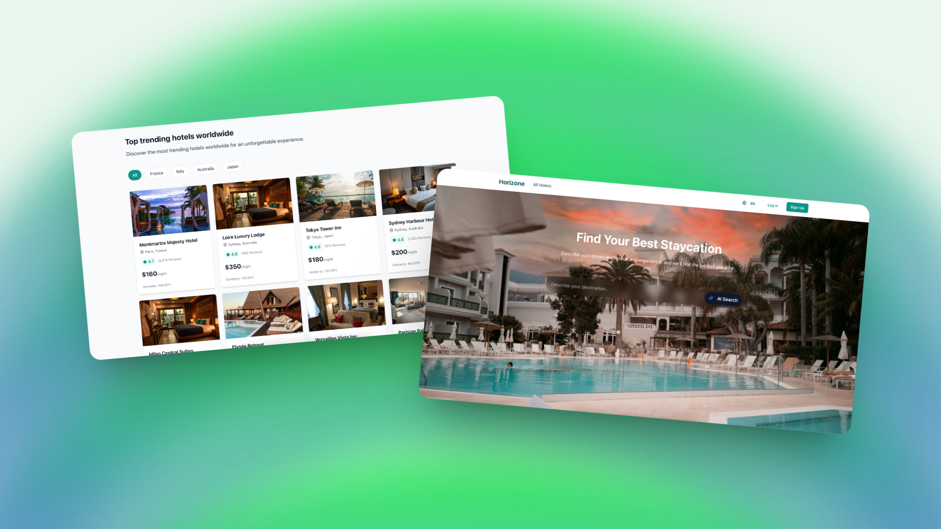 Horizone is an AI-powered hotel booking platform designed to redefine the accommodation search experience using natural language. Built as a personal showcase project, it demonstrates how semantic AI, clean architecture, and full-stack engineering can be integrated to deliver a modern, intuitive travel platform. Users can search for hotels using natural language (e.g., “peaceful beachfront with ocean views”), book stays securely with Stripe, and manage bookings via their account. Admins (hotel owners) can add hotels to the platform. The platform prioritizes both technical sophistication and user-friendly design.