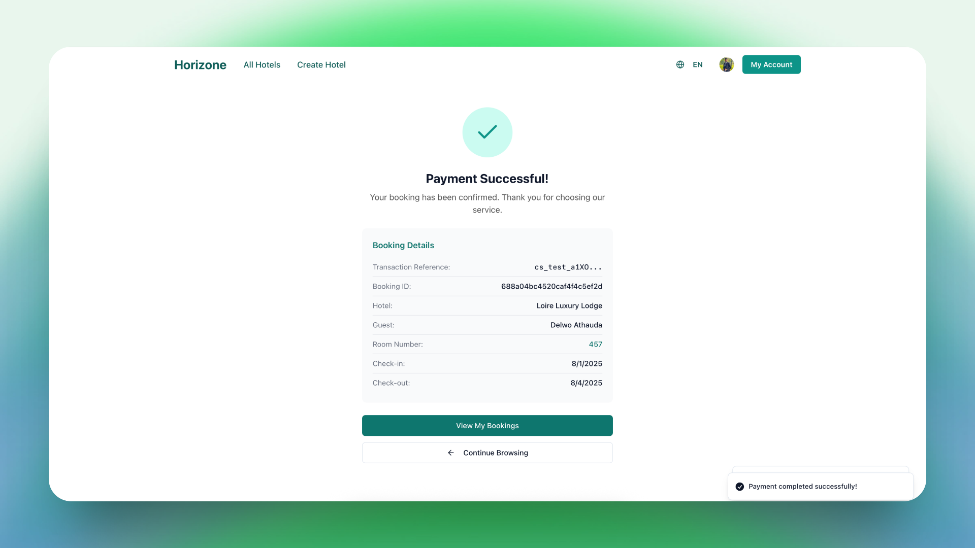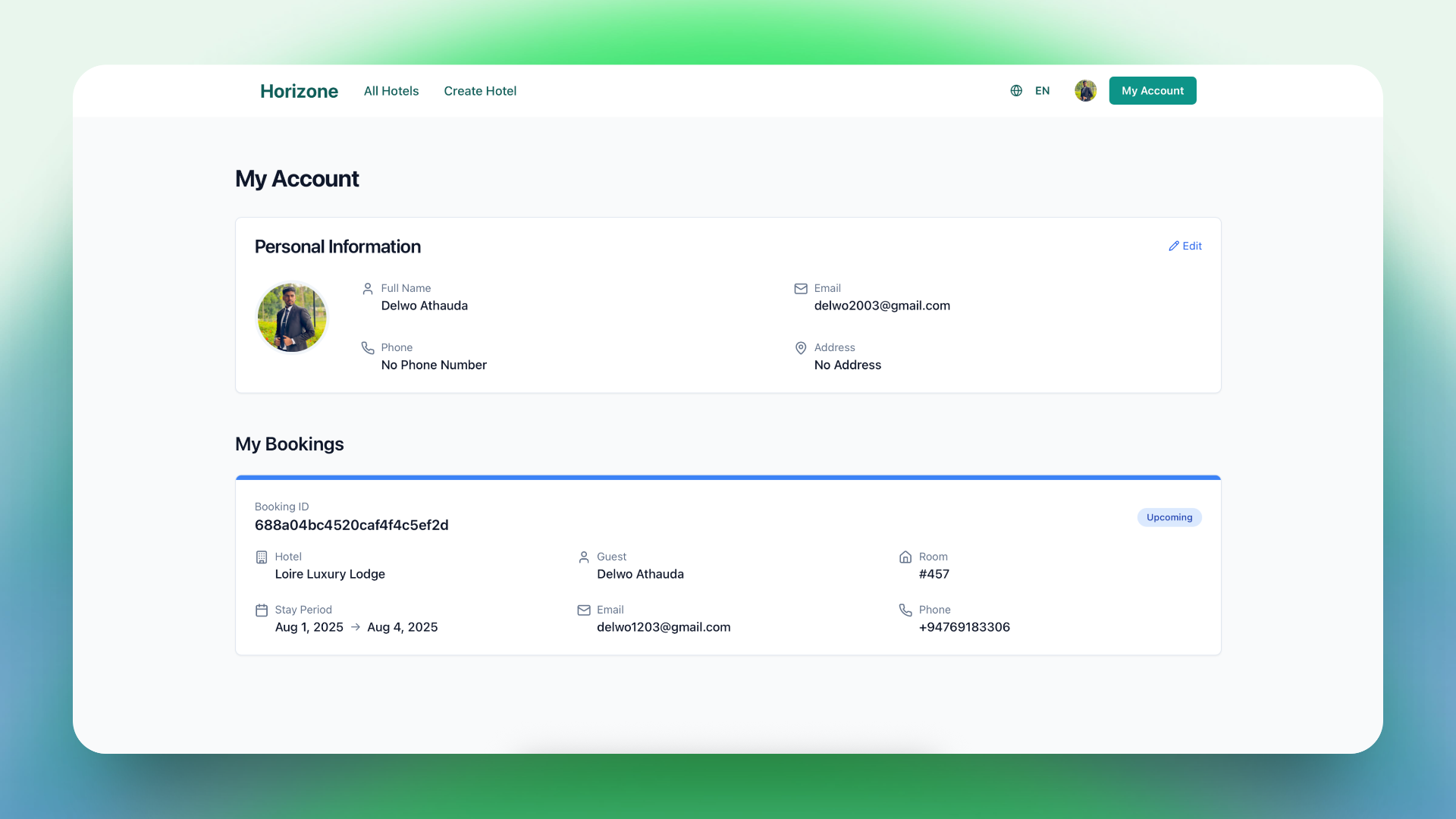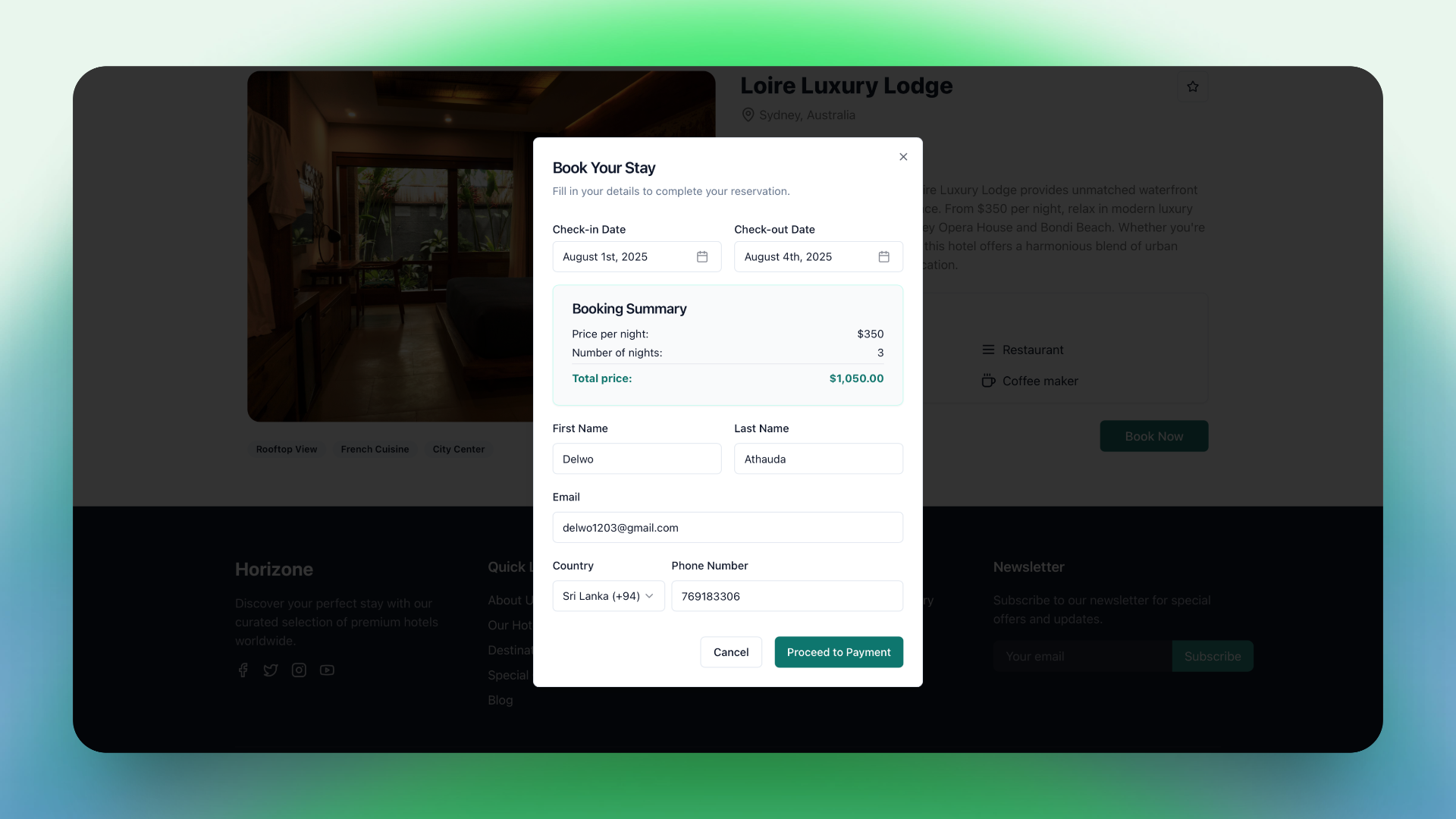 Horizone is an AI-powered hotel booking platform designed to redefine the accommodation search experience using natural language. Built as a personal showcase project, it demonstrates how semantic AI, clean architecture, and full-stack engineering can be integrated to deliver a modern, intuitive travel platform. Users can search for hotels using natural language (e.g., “peaceful beachfront with ocean views”), book stays securely with Stripe, and manage bookings via their account. Admins (hotel owners) can add hotels to the platform. The platform prioritizes both technical sophistication and user-friendly design.