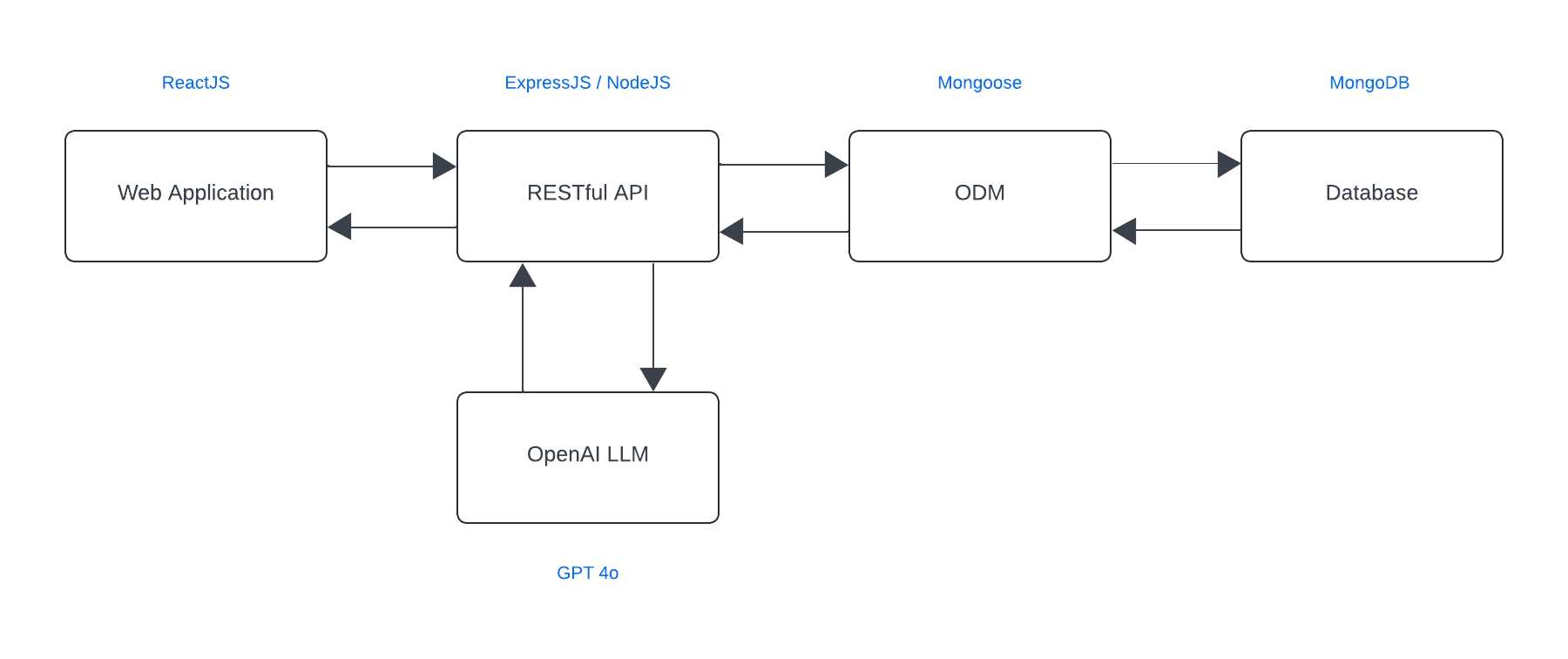 Server (Backend): The NodeJS + Express backend handles those requests, processes logic, communicates with OpenAI (for semantic search), and interacts with the database.